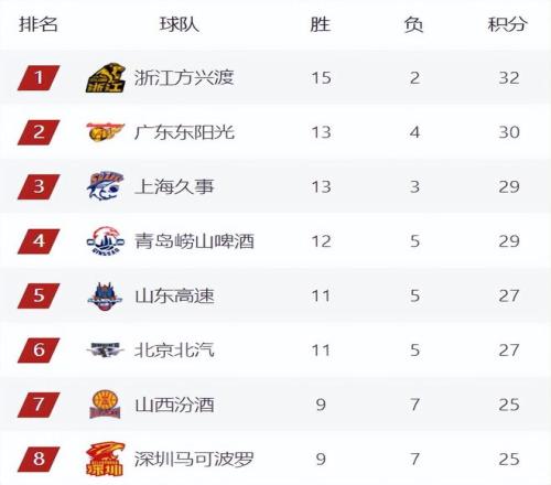 广厦豪取6连胜继续高居榜首,广东暂时来到第二,广厦和身后的广东已经完全拉开了差距,目前广厦阵容齐整,不出意外的话,他们会是第一阶段的榜首球队。山东击败吉林后,暂时来到第5,青岛战略性放弃比赛,让广东队重新坐稳了前三位置,青岛目前还是第4,看情况,青岛是将目标留在了未来和宁波广州的两场比赛,上海本轮将迎战北京,这将是一场重头戏,但相比之下,北京这次输球的可能性很大,毕竟球队现在也是伤兵满营,真不好打。