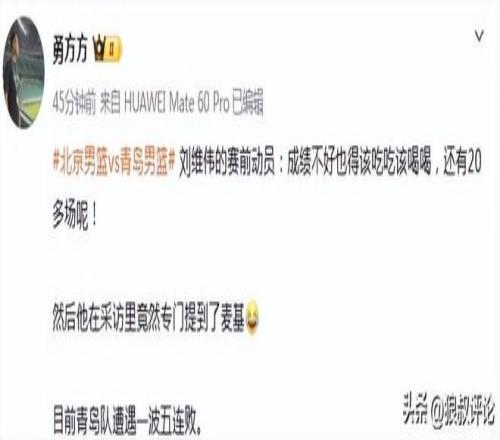 赛前,刘维伟动员球员表示:“成绩不好也得该吃吃该喝喝,还有20多场呢!”。