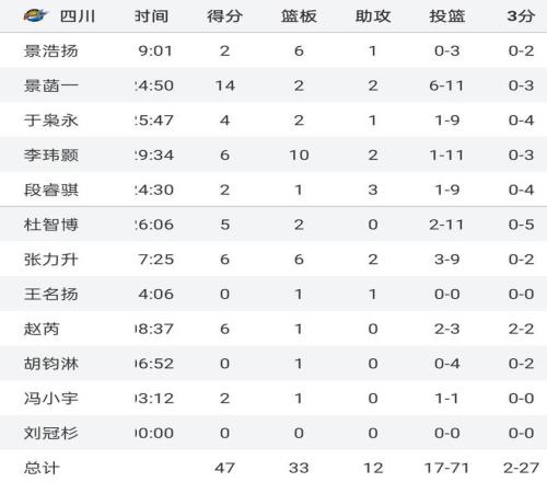 这场比赛,四川男篮真是刷新了职业球队的下限,全队12人,有11人上场,结果就景菡一1人得分上双,其他人的命中率完全可以用惨不忍睹来形容,下面是本场比赛四川队的赛后数据:全场投篮71次,但是只命中17球,命中率仅为23.9%,其中球队三大首发于枭永投篮9中1,李玮颢投篮11中1,段睿骐9中1,三大主力合计29中3,命中率刚过10%。此外,四川这场全队三分27中2,命中率仅为7.4%,要知道,很多都是空位三分,结果就投出这样的命中率,着实有些离谱。