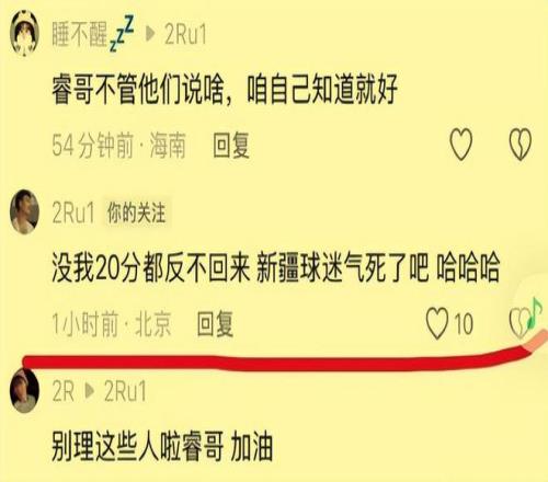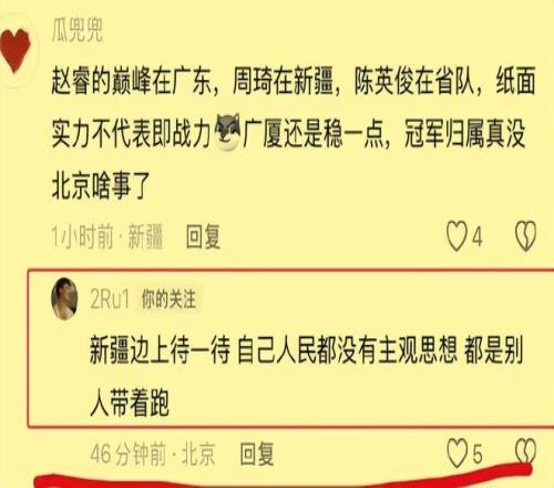 而在对阵青岛队的这场比赛投篮10中4手感冷凉,并且在关键时刻两罚尽失的北京首钢队后场绝对主力赵睿,输掉比赛后的心情本来应该就不太好,所以当他看到前东家新疆队的球迷留言评论他现在所效力的北京首钢队本赛季的争冠前景以及他的个人表现后火气一下子就上来了,立马怒怼了回去。