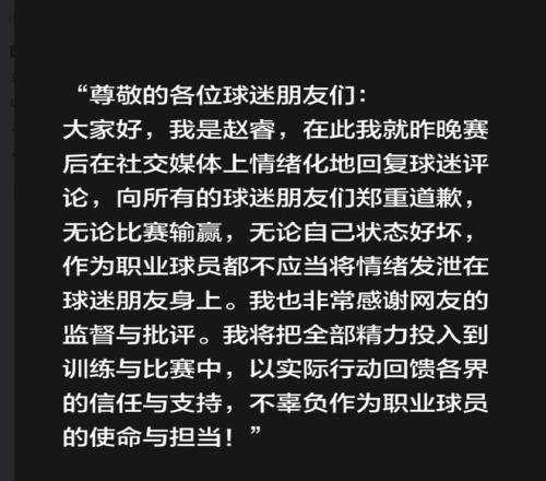 大家好,我是赵睿,在此我就昨晚赛后在社交媒体上情绪化地回复球迷评论,向所有的球迷朋友们郑重道歉,无论比赛输赢,无论自己状态好坏,作为职业球员都不应当将情绪发泄在球迷朋友身上。我也非常感谢网友的监督与批评。我将把全部精力投入到训练与比赛中,以实际行动回馈各界的信任与支持,不辜负作为职业球员的使命与担当!”