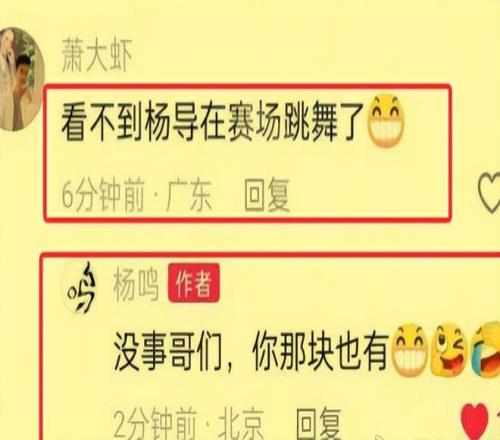但是,对于故意挑事的,杨鸣也绝对不会惯着。比如说有网友很明显是带着冷嘲热讽的腔调给他留言说:“再也看不到杨导在赛场跳舞了”,杨鸣也是毫不客气地予以了回应,他说“没事哥们,你那块也有。”怎么样?给力不?