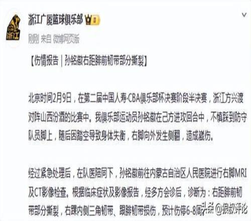 北京时间2月11日,根据广厦男篮官方社媒公示,孙铭徽右距腓前韧带部分撕裂,预计将会伤停6-8周。