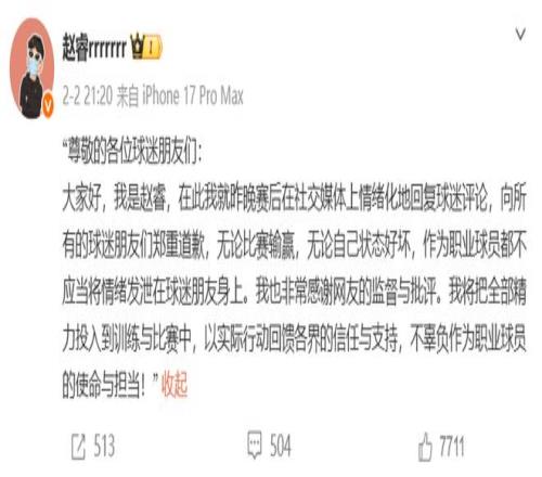 这场风波迅速发酵,其严重性远超普通的口水仗,由于涉及对特定地域及群体的不当表述,事件很快突破了篮球范畴。据媒体报道,新疆官方媒体甚至下场发文,以严厉措辞痛斥赵睿的言论严重伤害了新疆人民情感,那么在如山压力之下,赵睿于2月2日晚间通过个人社交媒体公开发文道歉。