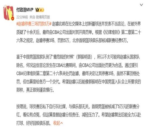 2026年2月11日,CBA公司的一纸罚单,将正处于国家队集训期的北京首钢球员赵睿推至舆论的风口浪尖,针对赵睿此前在社交媒体上对新疆球迷发表的一系列严重不当言论,CBA官方正式作出处罚决定:赵睿被停赛3场、罚款5万元,其所属的北京首钢篮球俱乐部同时被核减联赛经费5万元!这一处罚决定距离事发之日已过去十余天,关于这位中国男篮现任队长是否该被国家队除名的争论,在知名记者付政浩给出明确答案后,终于尘埃落定