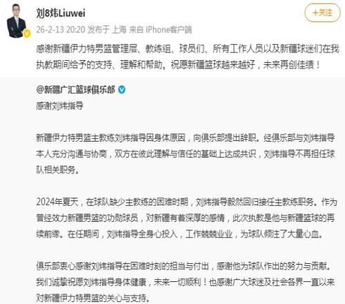 北京时间2月13日,在新疆男篮官方发布公告,宣布刘炜指导因为身体原因请辞,不再担任球队相关职务。刘炜通过社媒发声回应,感谢新疆伊力特男篮管理层、教练组、球员们、所有工作人员以及新疆球迷。