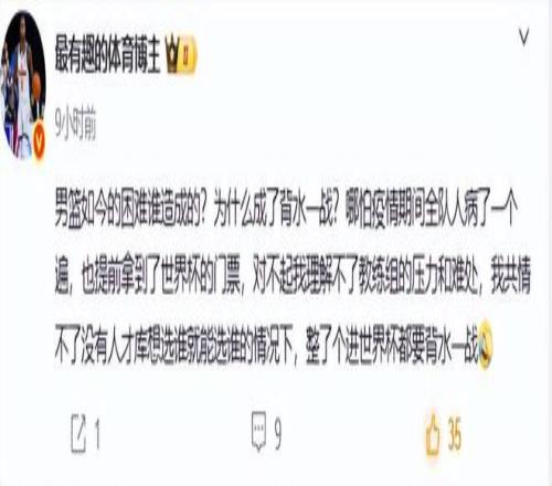 世预赛第一窗口期两败韩国,就充分证明郭士强的选人用人大大的错误。在国家队的用人问题上,郭士强真不如杜锋。媒体人最有趣的体育博主怒批道,“男篮如今的困难谁造成的?为什么成了背水一战?哪怕疫情期间全队人病了一个遍,也提前拿到了世界杯的门票,对不起我理解不了教练组的压力和难处,我共情不了没有人才库想选谁就能选谁的情况下,整了个进世界杯都要背水一战。”郭士强啊郭士强,你没有带上庞峥麟,而是带着赵继伟高诗岩这些后卫就是最大的错误,今晚如果再输,你真的该自动辞职了。你们说呢?