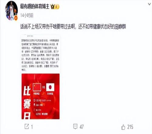 但是问题来,既然胡明轩达不到打比赛的要求,郭士强为何要带上他?媒体人最有趣的体育博主,对此也非常不满,直接喷郭士强,他说,“话说不上场又带伤干啥要带过去啊,还不如带健康状态好的庞峥麟”。媒体人说的非常有道理,既然胡明轩达不到比赛要求,为何要带上他?带上健康和状态均好的庞峥麟不比胡明轩好吗?可见郭士强的操作就是作死,胆子还是小了一点,人也太固执了,不少人认为庞峥麟是最适合打日本队的队员,他速度快,既能突破又有三分,对方对他也不了解,为何不能胆子大一些带上他?