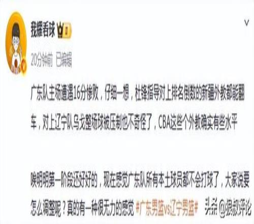 博主我耀打球发文点评:广东队主场遭遇16分惨败,仔细一想,杜锋指导对上排名倒数的新疆外教都能翻车,对上辽宁队乌戈整场球被压制也不奇怪了,CBA这些个外教确实有些水平
