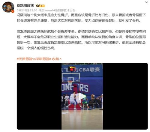 这是冯熙瑞的CBA生涯第二场比赛,他上一场比赛里面对广州龙狮男篮表现不俗,打了14分钟,贡献2分2篮板1助攻1封盖,给了球队很大的帮助,被深圳男篮的球迷所喜爱。没想到,在第二场比赛里,这个冉冉升起的新星就遭遇这样的伤病。