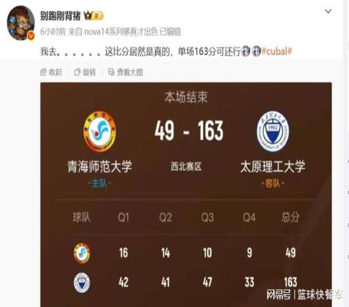 中国篮坛又出现大比分分差了。近日,在CUBAL联赛上又再次出现夸张分差。太原理工大学(以下简称太原队)客场挑战青海师范大学(以下简称青海队)。这是一场毫无悬念的比赛,双方首节便拉开了26分的分差,半场太原队已经手握53分领先优势。双方经过四节比赛后,太原队最终以163-49狂胜青海队114分,缔造了CUBAL联赛又一大惨案。