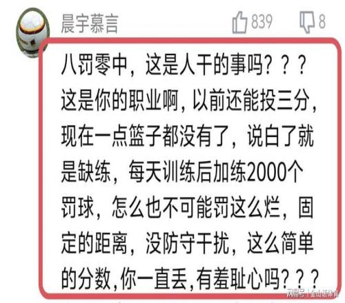 号称国内第一中锋的周琦,在罚球线灾难性的表现,也遭到网友们的纷纷吐槽。“八罚零中,这是你的职业啊,以前还能投三分,现在一点篮子都没有了,说白了就是缺练,每天训练后加练2000个罚球,怎么也不可能罚这么烂,固定的距离,没防守干扰,这么简单的分数,你一直丢,有羞耻心吗???”;“周琦 你这是职业球员? 我让我九岁的女儿,罚八个球她都不可能说一个不进,我一个老农民,单手也都不可能八罚不进,真的是悲哀!”。