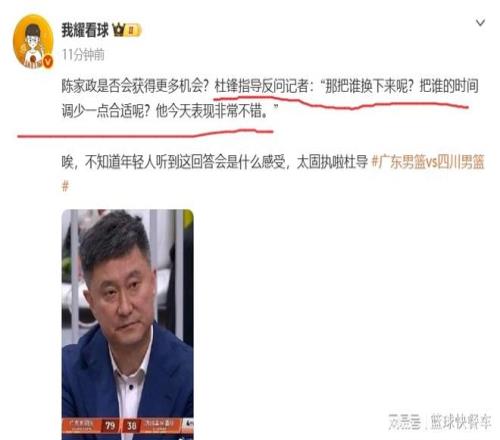 本场比赛,广东队小将陈家政状态火爆,出战13分钟,便7投6中,砍下20分。可在谈到陈家政以后会不会获得更多登场时间时,杜锋竟然直接反问记者:“那把谁换下来,应该把谁的时间调少一点合适?”很显然,在杜锋的战术体系里,胡明轩、杜润旺和张皓嘉,依旧比陈家政重要。这一场比赛,胡明轩得到3分,而张皓嘉出战37分钟,却只拿到5分,可他们的出场时间,却比陈家政稳定的多。