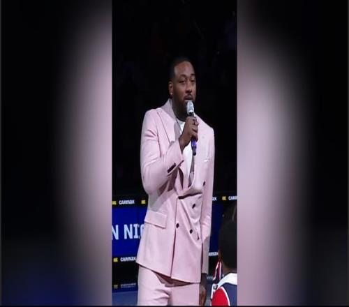 你看!华盛顿奇才的中场休息期间,球队为约翰・沃尔举办了特别纪念仪式。