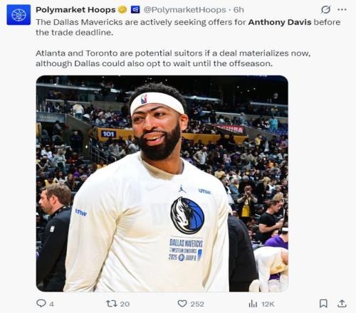 早些时候ESPN记者Shams在节目中表态,独行侠正在积极的听取安东尼-戴维斯的报价,联盟已经有一些球队跟独行侠取得了联系,重点关注的老鹰、猛龙两支球队。人独行侠并没有一定要在交易截止日前送走AD,球队可以等到休赛期再决定,1月初AD遭遇的手部伤势也减缓了交易的进程,因为他的价值正在缩水。