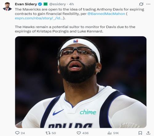 ESPN记者布兰德-麦克马洪表示,因为安东尼-戴维斯的交易价值缩水,独行侠愿意在AD的交易中只获得首轮签、年轻球员、到期合同,这样可以获得未来薪金空间的灵活性。由于老鹰队的波尔津吉斯、肯纳德是到期合同,所以老鹰是最值得关注的潜在买家。猛龙已经不再愿意为了AD拆散他们现有的阵容。