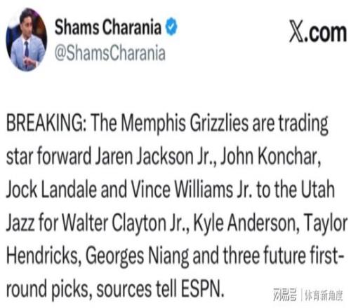 咱来看看这爆料大神Shams的消息哈:灰熊大手一挥,把3J(小贾伦 - 杰克逊)、康查尔、兰代尔还有小文斯 - 威廉姆斯打包送去了爵士,换回来李凯尔、小克莱顿、亨德里克斯、尼昂,外加三个首轮签。哟呵,好家伙,多达7换4呀,这妥妥是今年到目前为止最大的一笔交易诞生咯,简直就像在交易市场投下了一颗超级大炸弹!