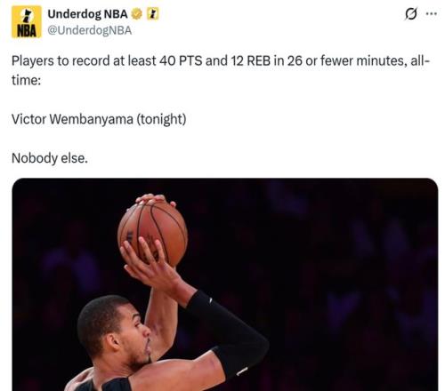 他还仅花费26分零6秒,也让文班亚马成为NBA近35年单场拿到40+得分用时最短的球员。