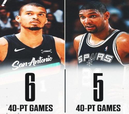 最终文班轰下40分也追平个人赛季得分纪录,并且是其生涯第6次砍下40+得分,在比邓肯少打1236场的情况下,40+场次已经超越邓肯,追平吉诺比利升至队史第4。