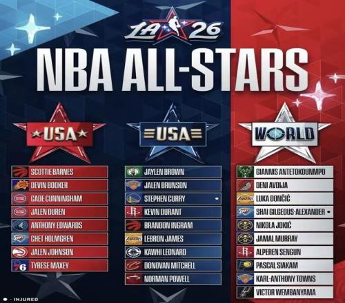 美国队分为“美国星队”和“美国条纹队”,从名单来看,“美国星队”主要集中了一众新生代球员,布克、爱德华兹、霍姆格伦、马克西以及本赛季志在冲击MVP的活塞当家球星康宁汉姆领衔;“美国条纹队”则是一众NBA门面球员,詹杜库同队以及布伦森、布朗、伦纳德等实力球员。其中,库里因伤缺阵本次全明星,联盟指派猛龙球员英格拉姆递补进入名单。