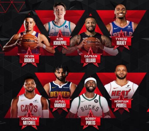 东部替补阵容:巴恩斯、杜伦、杰伦·约翰逊、米切尔、鲍威尔、西亚卡姆、唐斯;