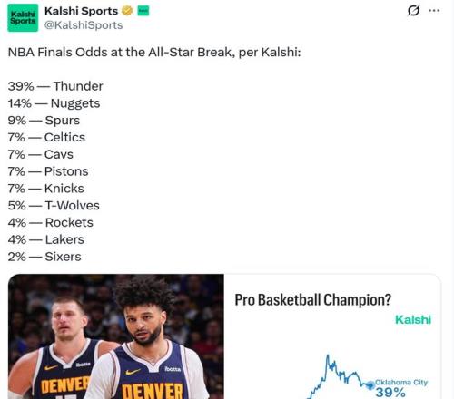 NBA最新夺冠概率出炉!短板明显的火箭队与湖人队皆为4%,骑士拿下哈登后7%屈居第4,第一雷霆39%概率断档领跑。