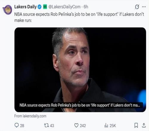 四天之前,根据湖人媒体Lakers Daily的报道,佩林卡在交易截止日前没有进行大面积的交易是为了囤积资产在今夏休赛期继续猛追扬尼斯-阿德托昆博,佩林卡的帅位也跟湖人下半赛季的战绩、季后赛的战绩、今夏引进球星等有关联。