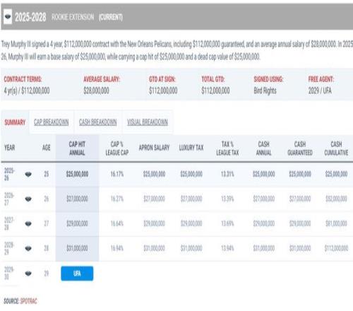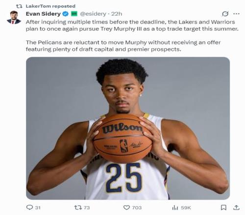北京时间2月13日,《福布斯体育》记者埃文-斯迪瑞透露,鹈鹕队在交易截止日不会交易锡安、墨菲、琼斯三位锋线,但在今夏休赛期勇士、湖人两支球队有意交易得到特雷-墨菲,鹈鹕队不愿意在没有收到大量首轮签资产的情况下低价送走墨菲。