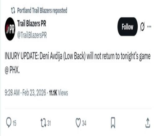 阿夫迪亚开局后不久伤退,开拓者官方宣布其因腰部受伤退出本场比赛。
