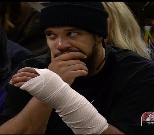 因左手骨折缺席的狄龙,本场出现在场边为队友加油