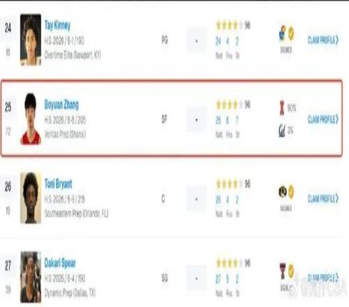 对了,张博源已被多家美国权威体育媒体评为四星高中生,其中在选秀网站Rivals发布的2026届全美高中生最新排名中位列全美第25,成为该榜单排名最高的中国球员。