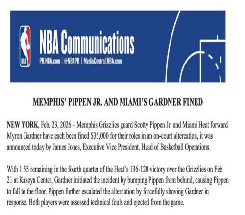 北京时间2月24日,NBA官方开出罚单,宣布此前在场上互殴的小皮蓬与加德纳均罚款3.5万美元。