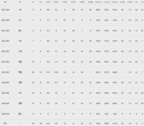 常规赛出战237场首发118次,场均上阵23.7分钟拿到8.9分5.2板1.2助进账,三项命中率41.4%、30.9%和67.7%;季后赛出战七场,场均上阵18分钟收获6.6分6.7板,三项命中率41.9%、50%和90%。