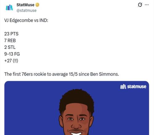 这也是埃奇库姆新秀赛季至今整体傲人表现的缩影,开赛至今他场均可以拿下15.3分5.5板,成为16年本西蒙斯后,76人近10年首位能够做到场均至少15+5的新秀。