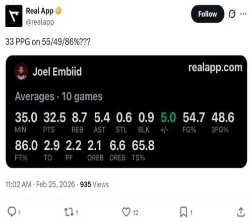 这也是恩比德近一个月火爆状态的缩影,过去10场比赛中,恩比德场均可以拿下32.5分8.7板5.4助华丽数据,并且三项命中率高达55/49/86%,真实命中率65.8%。