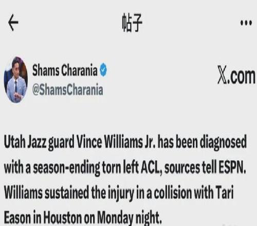 爆料王Shams:爵士后卫小文斯-威廉姆斯确诊左膝前十字韧带(ACL)撕裂,赛季报销。