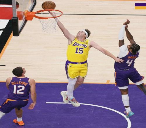 艾顿更衣室发泄不满之后,今天3投1中仅得2分4板,正负值-24全场最低。詹姆斯出战35分钟,投篮16中7,三分3中0,罚球2中1,拿到15分6板5助,正负值+5。太阳最后一攻,阿伦突进内线,詹姆斯想起跳封盖,跟东契奇撞一起。