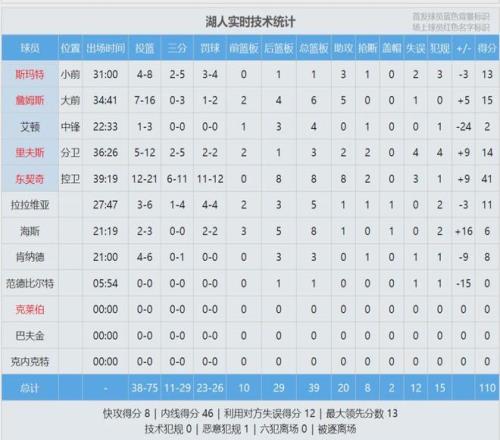 湖人遭遇3连败,34胜24负暂列西部第6,太阳34胜26负西部第7,两队仅剩1个胜场差。过去两场,太阳场均79分,今天打湖人狂轰113分。湖人后卫斯玛特赛后说:“作为竞争者,这样的比赛确实能给我们带来伤害。”最后看看数据: