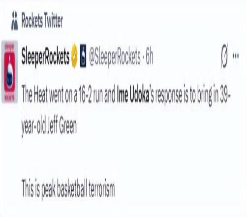 休媒也指责乌度卡,在热火打出那一波16-2的攻防浪潮后,乌度卡没有任何的调整,他只将39岁的杰夫-格林给换上。这简直就是恐怖主义的篮球巅峰。