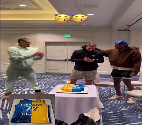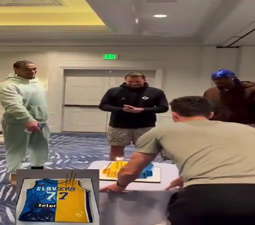 之后,湖人工作人员为东契奇送上了斯洛文尼亚国家队的球衣和湖人球衣拼接样式的蛋糕。