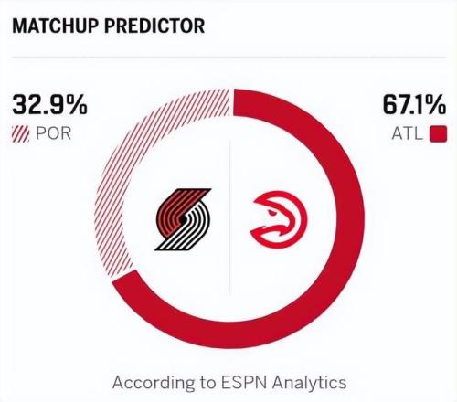 老鹰近期连胜的对手为篮网、奇才,整体实力偏弱,连胜含金量相对有限;开拓者状态同样起伏不定,两队近期表现与竞技状态差距不大。综合来看,老鹰略占优势,且此役是开拓者连续客场第三战,还将面临背靠背作战,体能消耗较大!ESPN预测本场比赛,老鹰胜率67.1%,开拓者胜率32.9%。