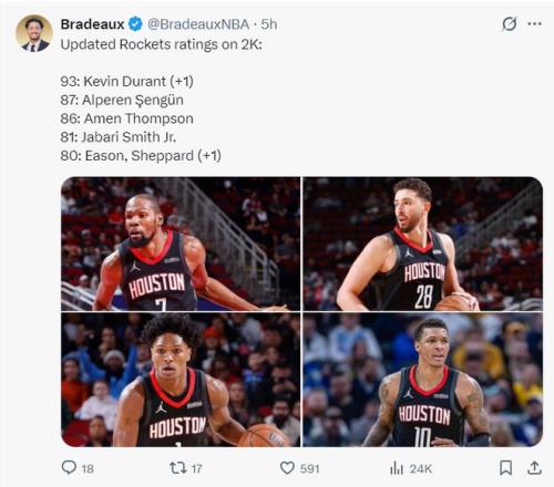 赛前,火箭记者Bradeaux晒出2K能力值变动,伊森与谢泼德都+1升至80,杜兰特也+1升到93,近期伊森与谢泼德的表现非常出色。