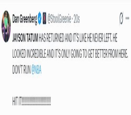 绿凯记者:杰森-塔图姆终于回归了!仿佛他从未离开过一样,他看起来状态很好,而且接下来会越来越好。