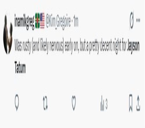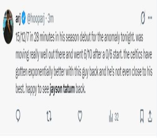 美媒:28分钟不到拿到15+12+7,他在场上的表现非常出色,前6中0,后10中6。自从塔图姆回归后绿凯的综合实力有了很大提升,而且塔图姆还不是最佳状态,很高兴看到他的回归。