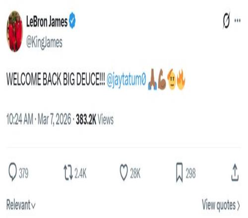 41岁詹姆斯也在第一时间隔空送上祝福:“欢迎回归,Big Deuce(塔图姆的外号)。”
