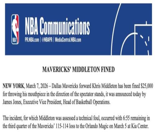 联盟表示,该事件发生在周五独行侠客场对阵魔术的比赛中,第三节还剩6分55秒时。米德尔顿当场已被判罚一次技术犯规,罚款2000美元,今日再追加25000美元罚款。