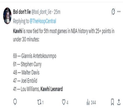 这场比赛科怀-伦纳德延续了个人的纪录:1.连续41场比赛拿到20+生涯新高;