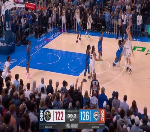 ——剩下9秒前,杰林威廉姆斯犯错,约基奇与穆雷防拆,接球投进三分的同时,杰林推倒了穆雷,按规则,穆雷加罚命中,一个回合,掘金拿了4分,追平比赛