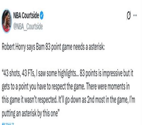 霍里在节目上表示,阿德巴约的83分应加个星号。“43次出手,43次罚球。我看了集锦... 83分确实令人惊叹,但比赛到了某个程度,你必须尊重这项运动。这场比赛中有一些时刻并未没有尊重比赛。这会成为历史上单场第二高分,但我会给它加个星号标记。”