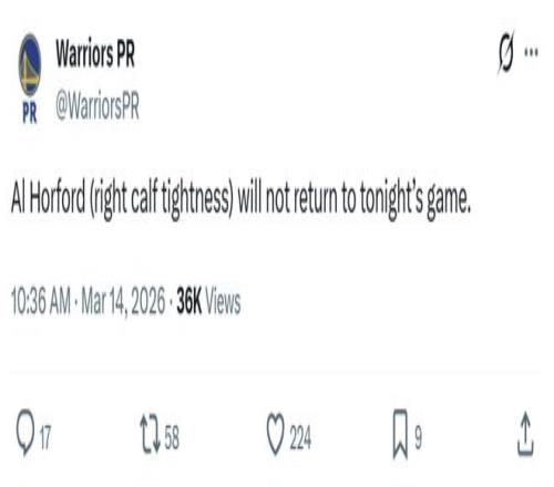霍福德仅出战5分钟后因左小腿肌肉紧绷退赛,接着小库里与波斯特也接连伤退,勇士队一场比赛直接伤了三人。